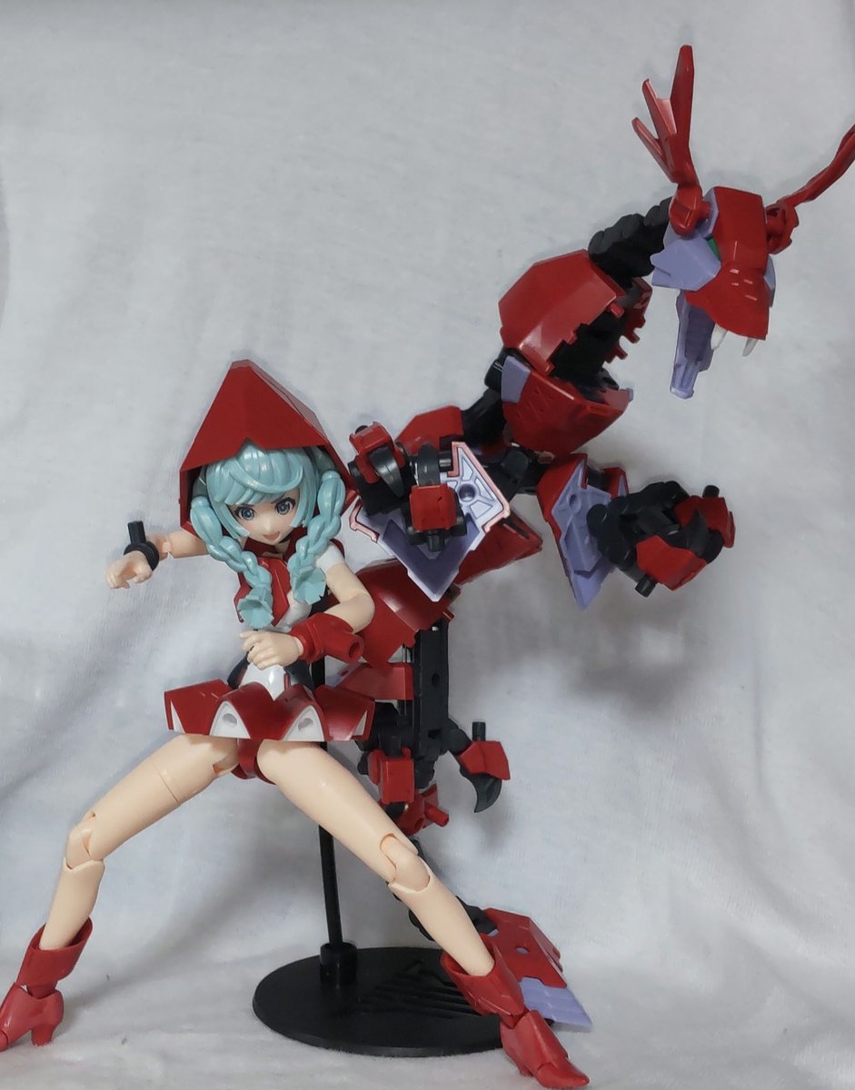 54 253 アリスが完成したので赤ずきんパーツとグレート合体。赤ずきんは上半身、アリスは下半身のパーツが豊富なので組み合わせやすいですね。肩にケモノ頭はどうしてもやりたかった #メガミデバイス 22/07/24 21:41