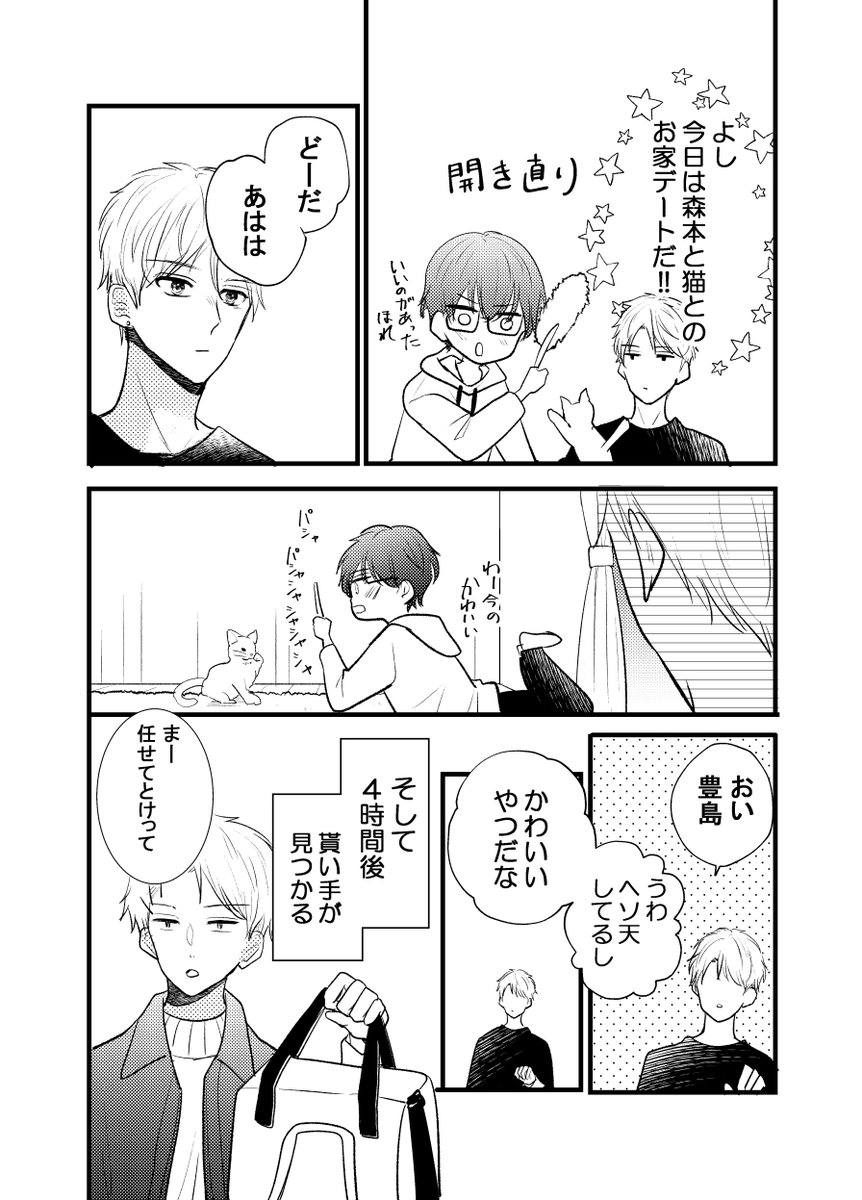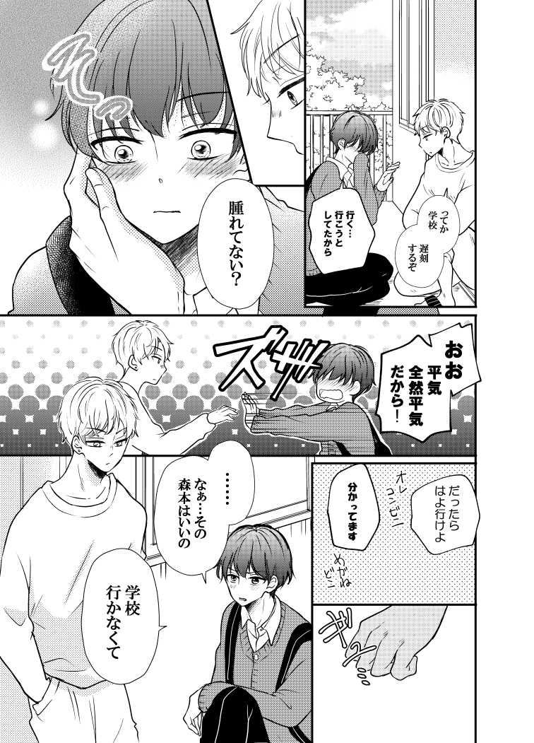 ご無沙汰です。森本と豊島のお付き合い続いてます編、描きました。 【騙されてはいけません。】(1/3) 不良少年×真面目少年 ある事情から二人付き合うことになっちゃた話 始めから読む→ twitter.com/medakanoarako/… #創作BL #騙されてはいけません。