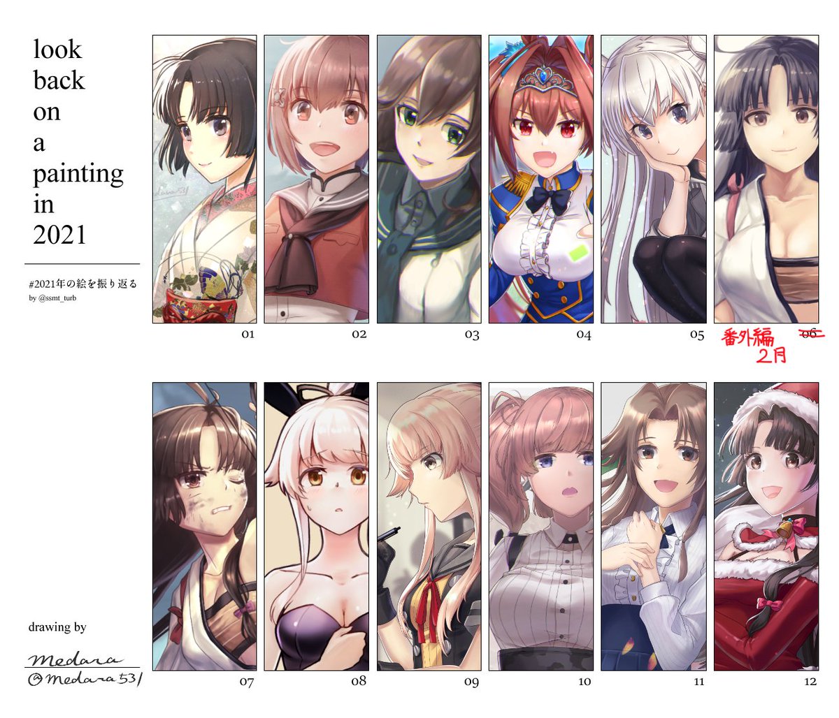 忘れてたので突貫で作りました。 6月だけ抜けちゃったんですけど他の月は2枚以上描いてたので去年よりは描けてたみたいですね… でも6月枠がもったいないので番外編入れちゃいました😌 今年はSkebも始めたので描く理由ができましたし、来年も無理せず描いていきたいですね。 #2021年の絵を振り返る