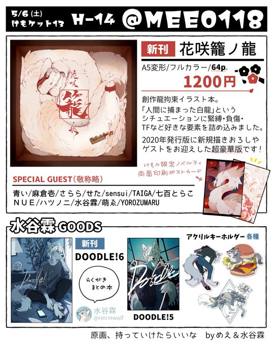 70 221 🌸5/6(土) #けもケット13 お品書き🌸 TRC東京流通センター第一展示場【H-14】 3年ぶりのイベント参加、けもケットは初めてです! 水谷霖さん(@rinrinwolf)も一緒にいます🐺✨ 23/04/22 23:08