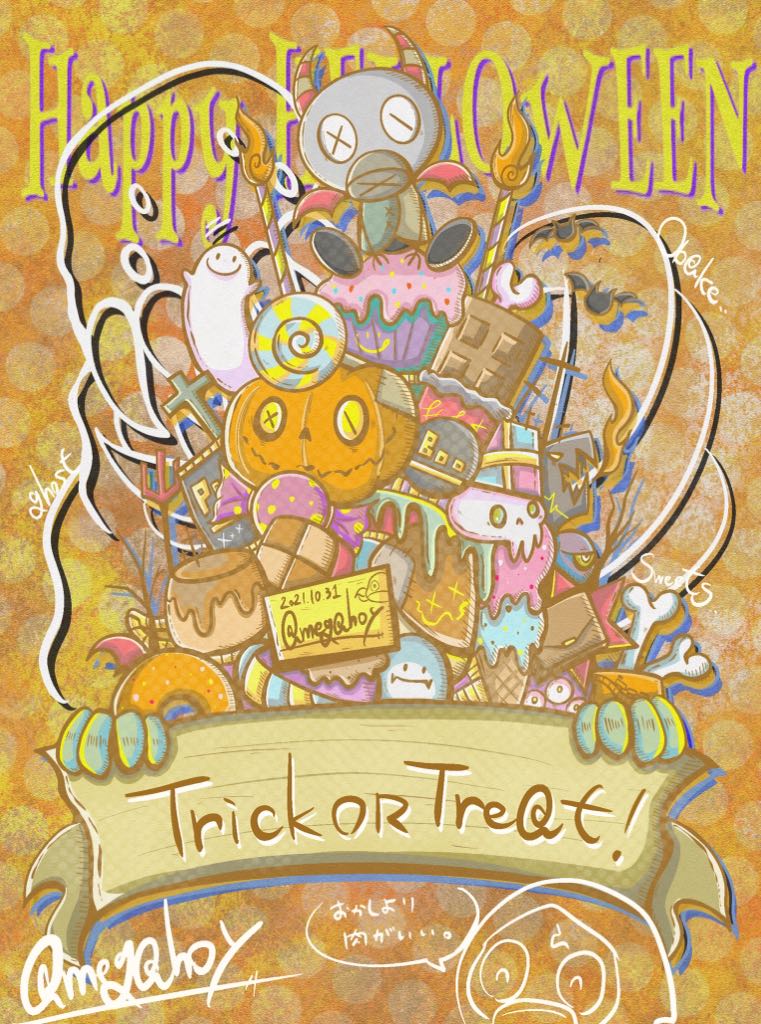 トリックオアトリート!お菓子をくれなきゃ… あ、ごめんやっぱりお菓子より肉がいいわ。 #ハロウィンイラスト展示会2021 #ハロウィン #イラスト #Halloween #megahoymask #halloween2021