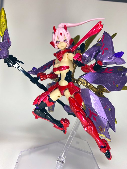 九尾さん完成(*´꒳`*)✨ 赤と紫の相性良いですね✨ キャンディレッドのツヤツヤ感がいい! クリアーパーツはシルバー吹いてクリアーイエローで塗装してます✨ 武装はクリアー吹いた後に手でラメをまぶしてます… ラメいらなかったかもですね… 次は青スサノヲを作ります!! #メガミデバイス