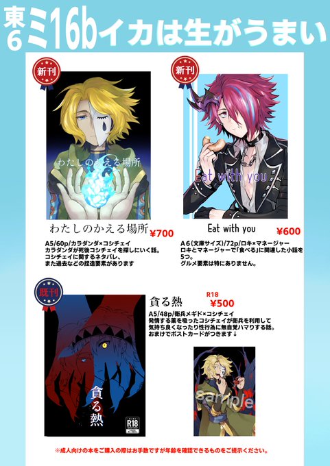 ①7月30日開催のゴエリンでのお品書きです~ミ16b「イカは生がうまい」にてお待ちしております!間に合えばカラコシ本購入された方に本に関する折本が付きます。 午後に1時間ほど買い物で離れますがスペースは売り子さんが対応してくださる予定です! ツリーで新刊サンプルと取り置き関連についてです↓