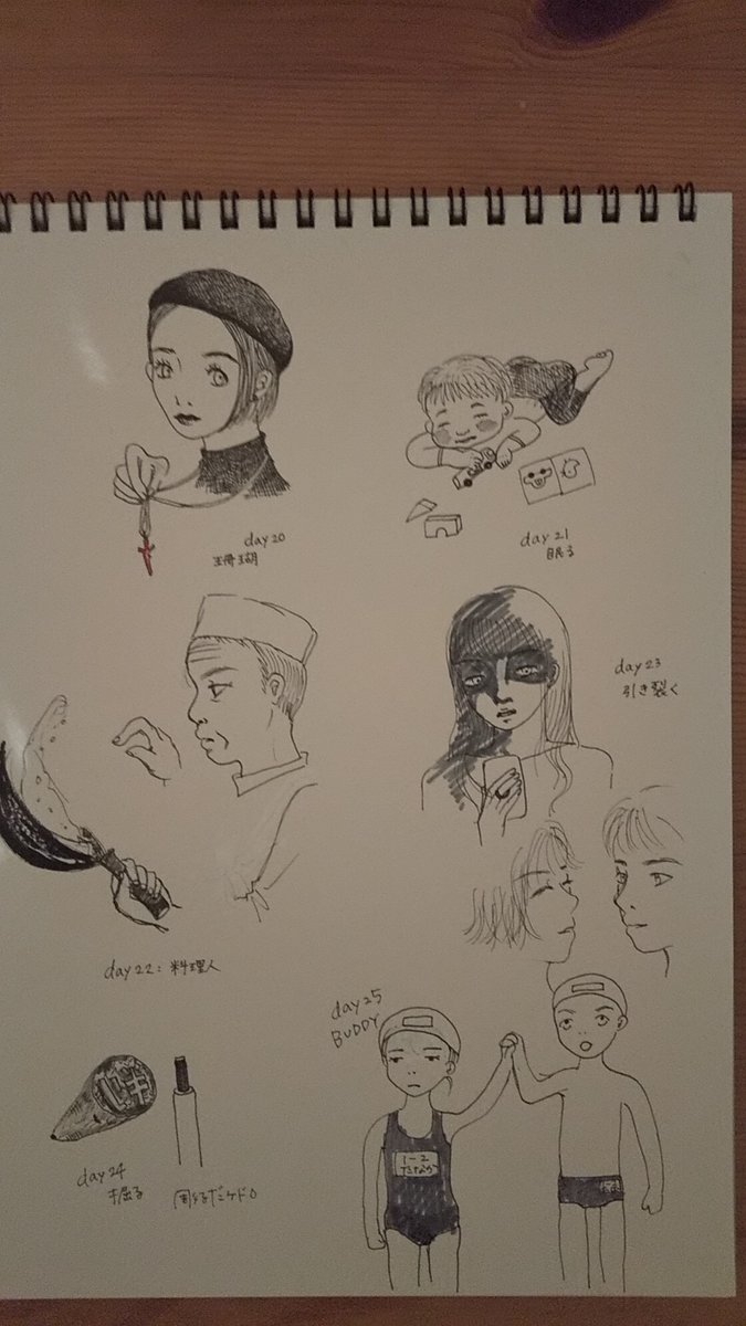 すべて下書きなしのホワイト使いまくり。。じっくり絵を描く時間を作らずにいるわ… 小学校のプールで、入る前と上がった後に「バディ」の掛け声でクラスメイトの安否確認をさせられた。今もやってるのかな #inktober2020