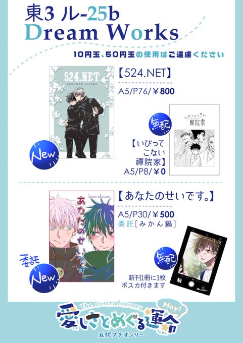 ル-25b【Dream Works】で参加します。 ン年振りのサークル参加&呪初スペースですドキドキする~! みかんさん<twitter.com/ju_mikan0403 チの新刊をご本人ごと笑お預かりします☺ ので私が落としても五伏本は! あります卓上に!!笑笑 #さとめぐプチ