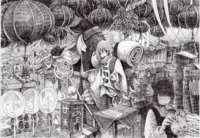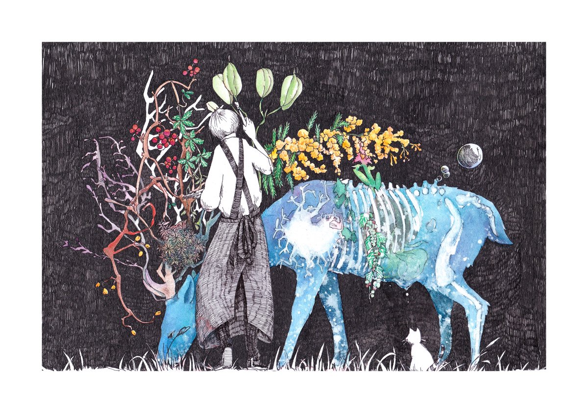 「摘んだ花には命が宿る」と彼は生前、よくよく申しておりました。もう続かない未来の存在に気づいた時に生き物は初めて自分が生かされていると分かるのだと、そんなような話でした。 #illustration #ペン画