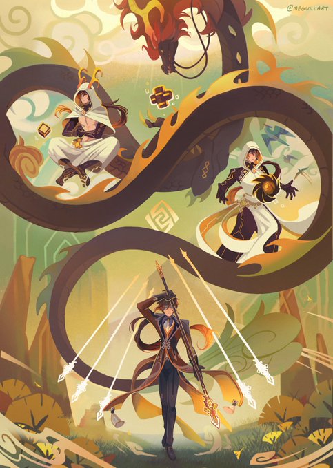 A WIP for a pair of drawings I'm working on with Zhongli and Venti doing a little 🪄 on Xiao... #xiaoven | #zhongxiao