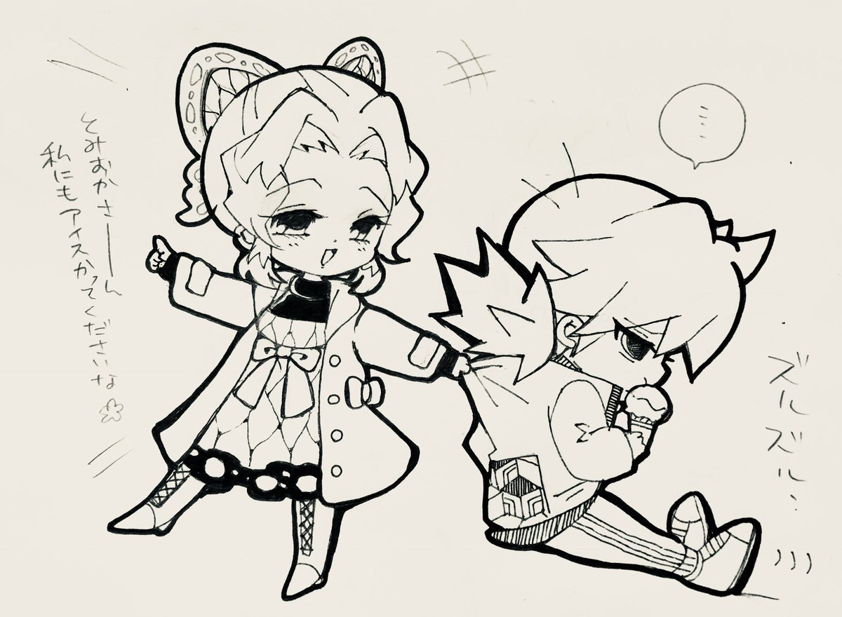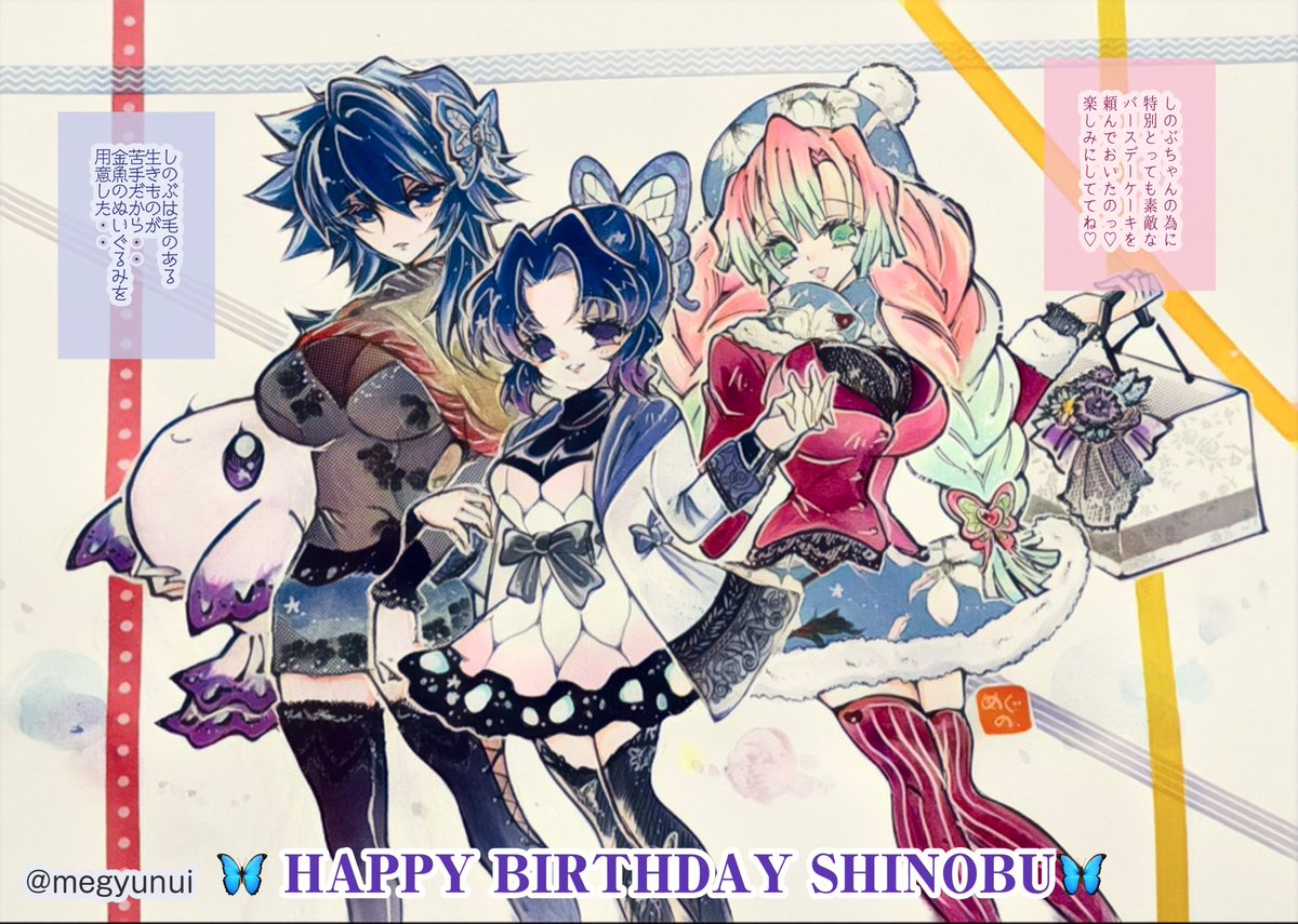 本日はしのぶ🦋.*˚さんのお誕生日なので過去絵諸々アップ🙌 現パロなぎゆゆ🌊♀と🦋さんと🍡ちゃんの仲良しバースデーおデート♡ としのぎゆらくがきとミルキーコラボの時に描いた漫画(の一部)