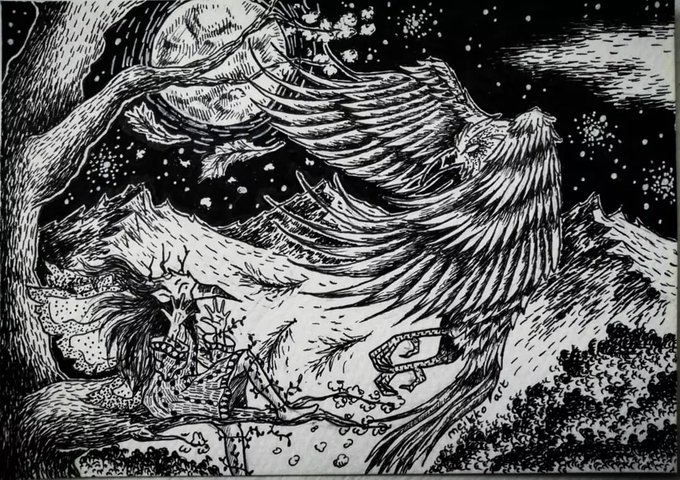 This was my drawing for day 5 of #Inktober 2021, the theme being #Raven. Follow my instagram: instagram.com/meikkoart for more of my drawings! #artistsontwitter #inkart #drawing #illustration #penart #inkartist #art