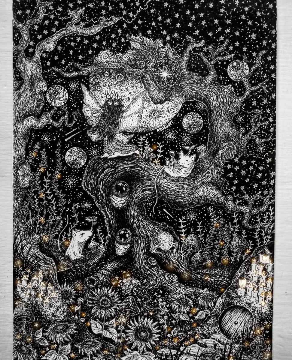 My piece for #inktober 2021, day 13. The theme was "Roof". Follow my Instagram for more drawings and WIPs: instagram.com/meikkoart #art #artistsontwitter #inkart #penart #illustration #inkillustration #drawing #penandink