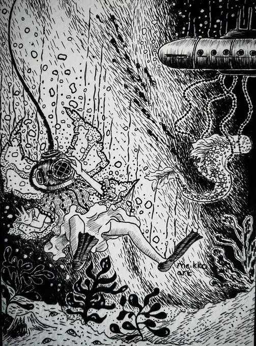 My drawing for #inktober 2021 day 3, the theme was "Vessel". Although diving doesn't strictly relate to "vessels", I liked the idea of drawing something underwater, plus submarines link to the prompt :) #artistsontwitter #art #inkart #penart #illustration #drawing #penandink