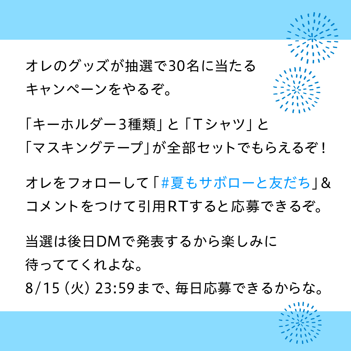 オレのグッズが抽選で当たるキャンペーンはじまったぞ。 フォローと引用RTで参加できるぞ。 当選は後日発表するから楽しみに待っててくれよな。 #夏もサボローと友だち #キャンペーン
