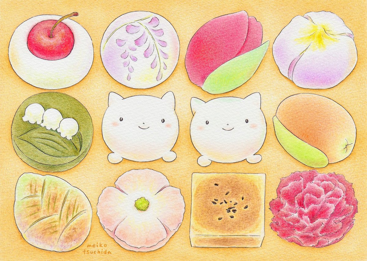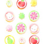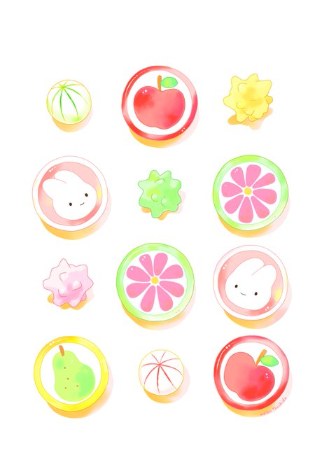 4 65 和飴とこんぺいとう うさぎ・りんご・洋梨・コスモスの金太郎飴など。淡い色のお菓子🍬 #イラスト 21/09/17 12:00