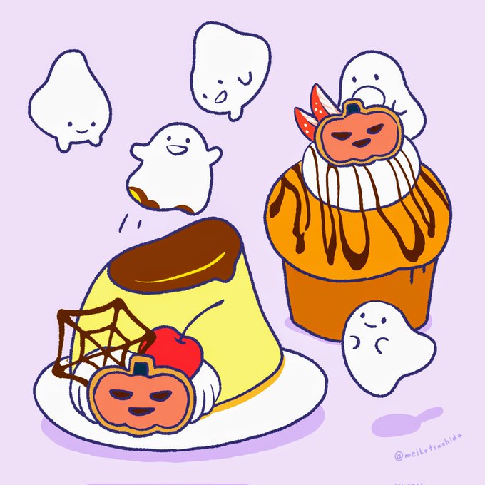5 63 ハロウィンスイーツとおばけたち プリンでトランポリンしてる #イラスト #ハロウィンイラスト展示会2021 21/10/15 11:56