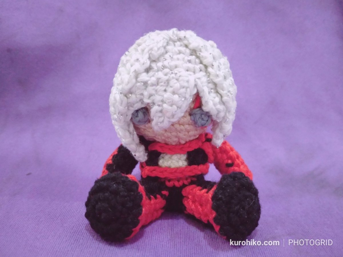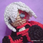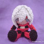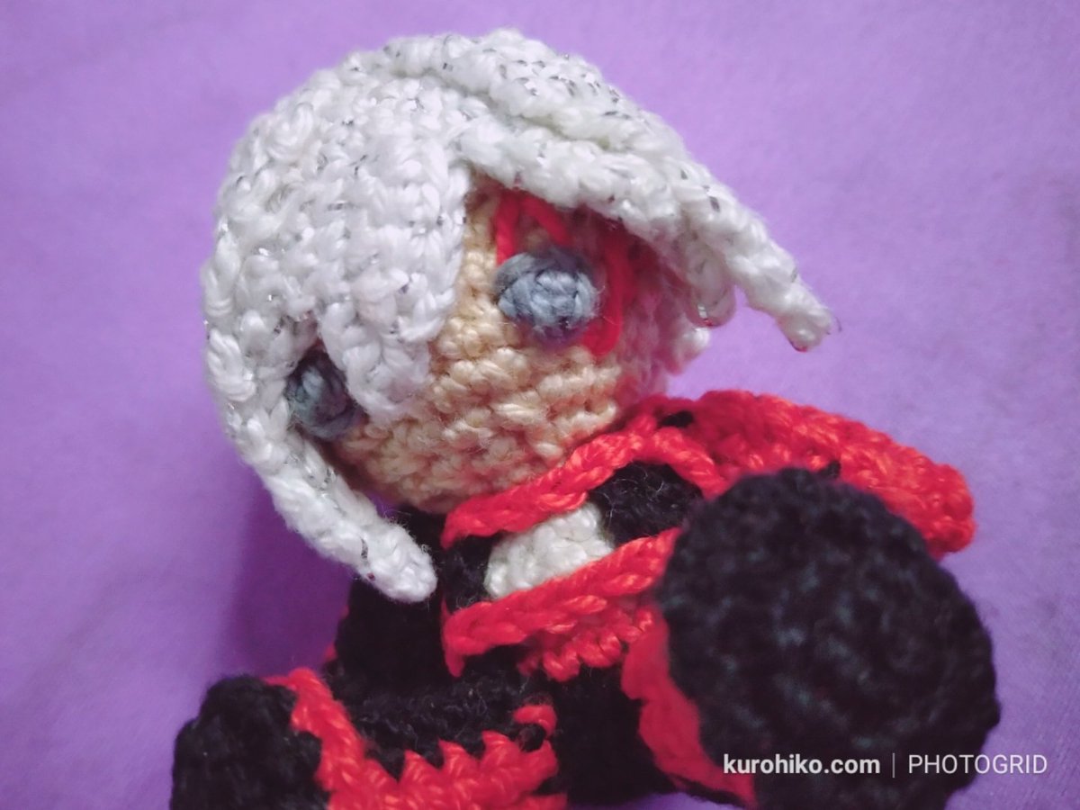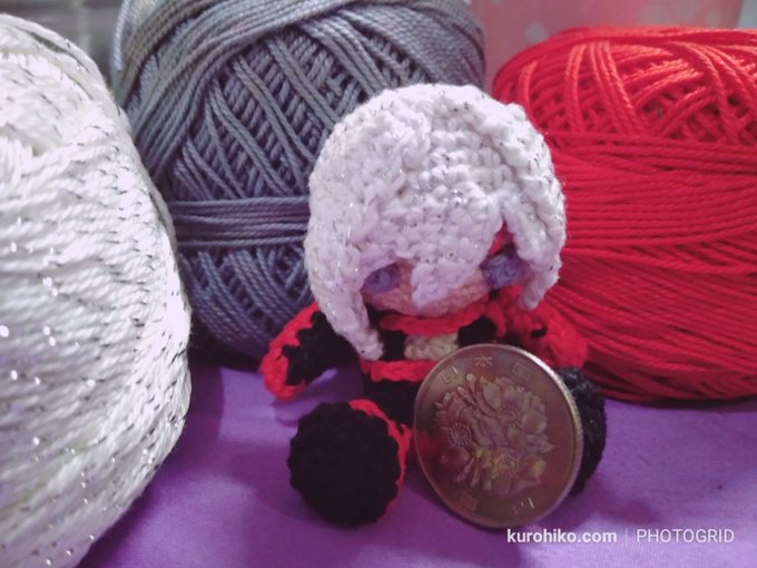 Here is a ¥100 for comparison. Tiny Fuu-chan is a little under 2 inches high? Legs are about an inch length. I used a special yarn for his hair. It's white, but it has a shiny silver strand weaved into it. I added some black stitching to his cyborg arm too. #FulGallery #amigurumi