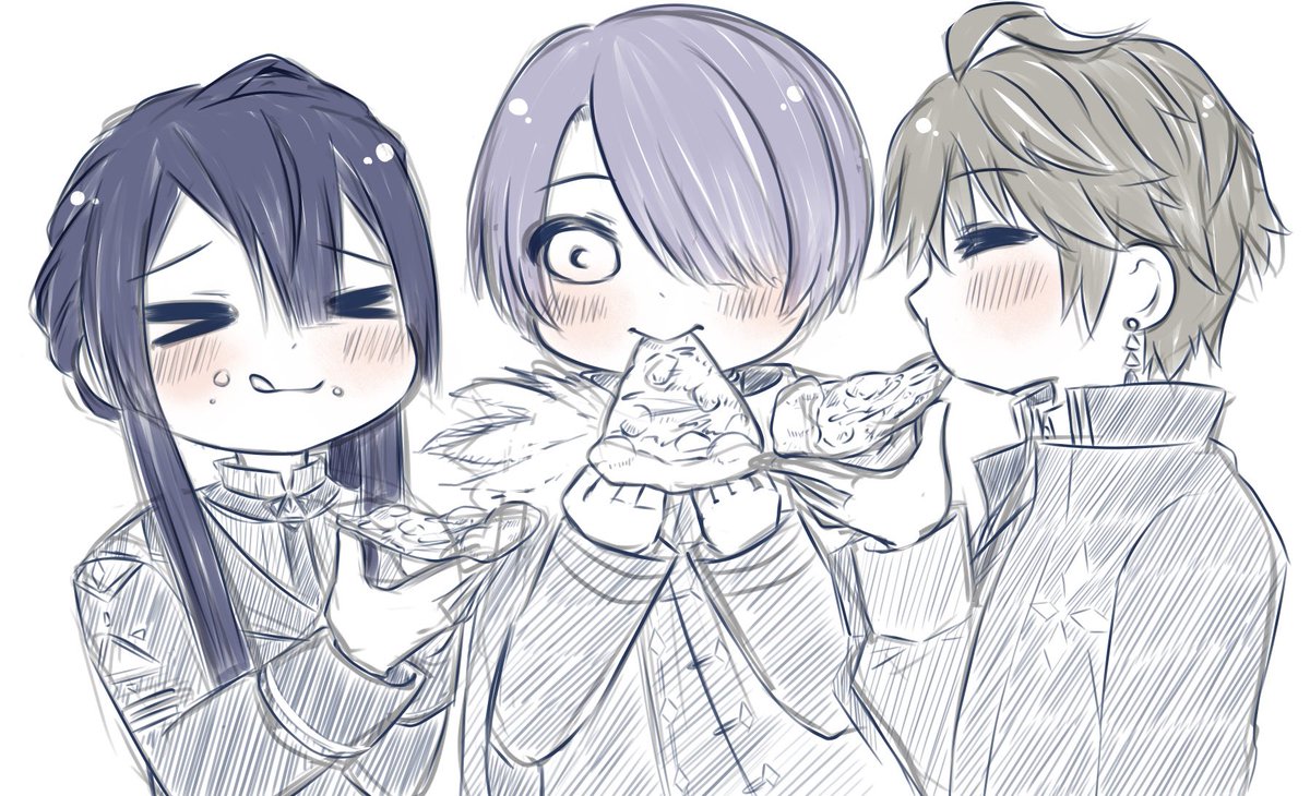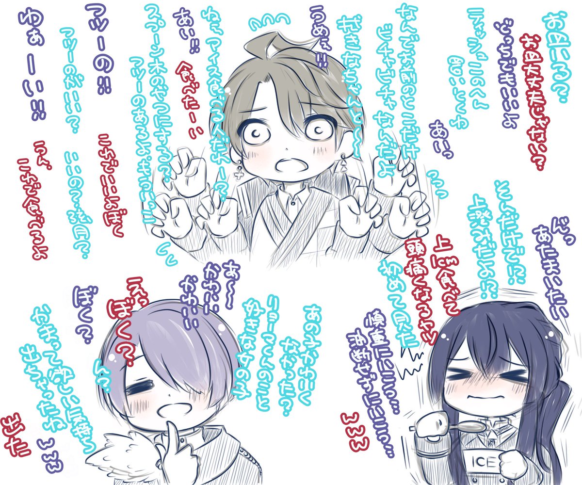 またみんなでピザオフして欲しい 🔺2枚目はそれぞれのココスキポイント 甲斐田→言い方が全部優しくて好き 弦月→自分のかわいさ分かってて好き 長尾→アイスの冷たさにやられちゃうの好き #桜魔の土産 #上弦画 #長尾百景 #描いた晴