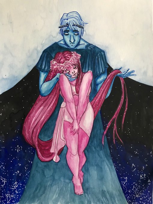 3 #inktober2018 done in a row, all cuz I read webcomic #loreolympus in one sitting and I am hooked! Not the most traditional #inktober with colored #ink and #watercolor 🌌 🌸@used_bandaid #hadesandpersephone #hades #persephone #greekmythology