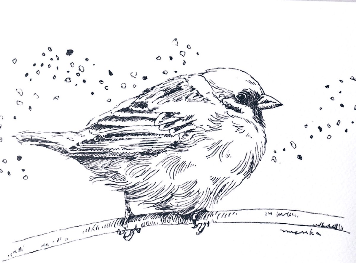 散歩してると雀ちゃんがやってきて 近付くと飛んで離れて、、 また近付いてくると飛んで離れて、、 という遊び?かな?を何度もやってる #ペン画