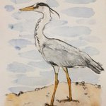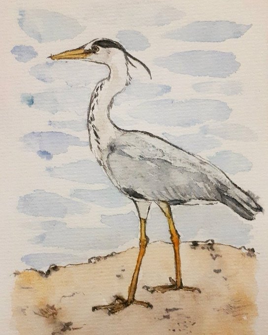 アオサギ。 サギは魚をとる時に、水面の光の屈折も考慮して魚を狙ってるそうですね。 何度も失敗して磨かれて、熟練ハンターになるのかな。 #鳥 #イラスト