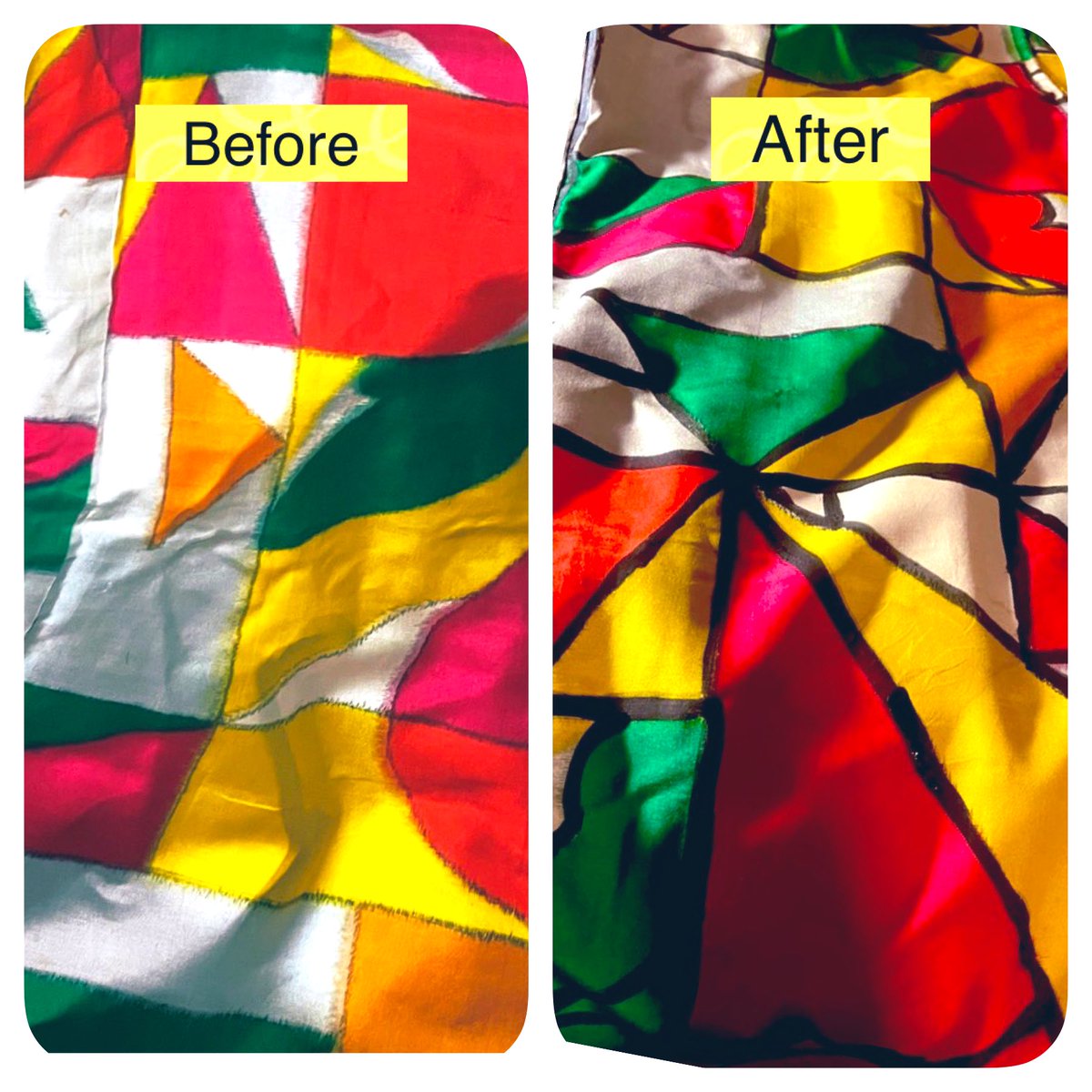 シミのあった着物に線を描きました ステンドグラスっぽくなって良い! (黒ジェッソと布用メディウムを2:2) #ペイント着物