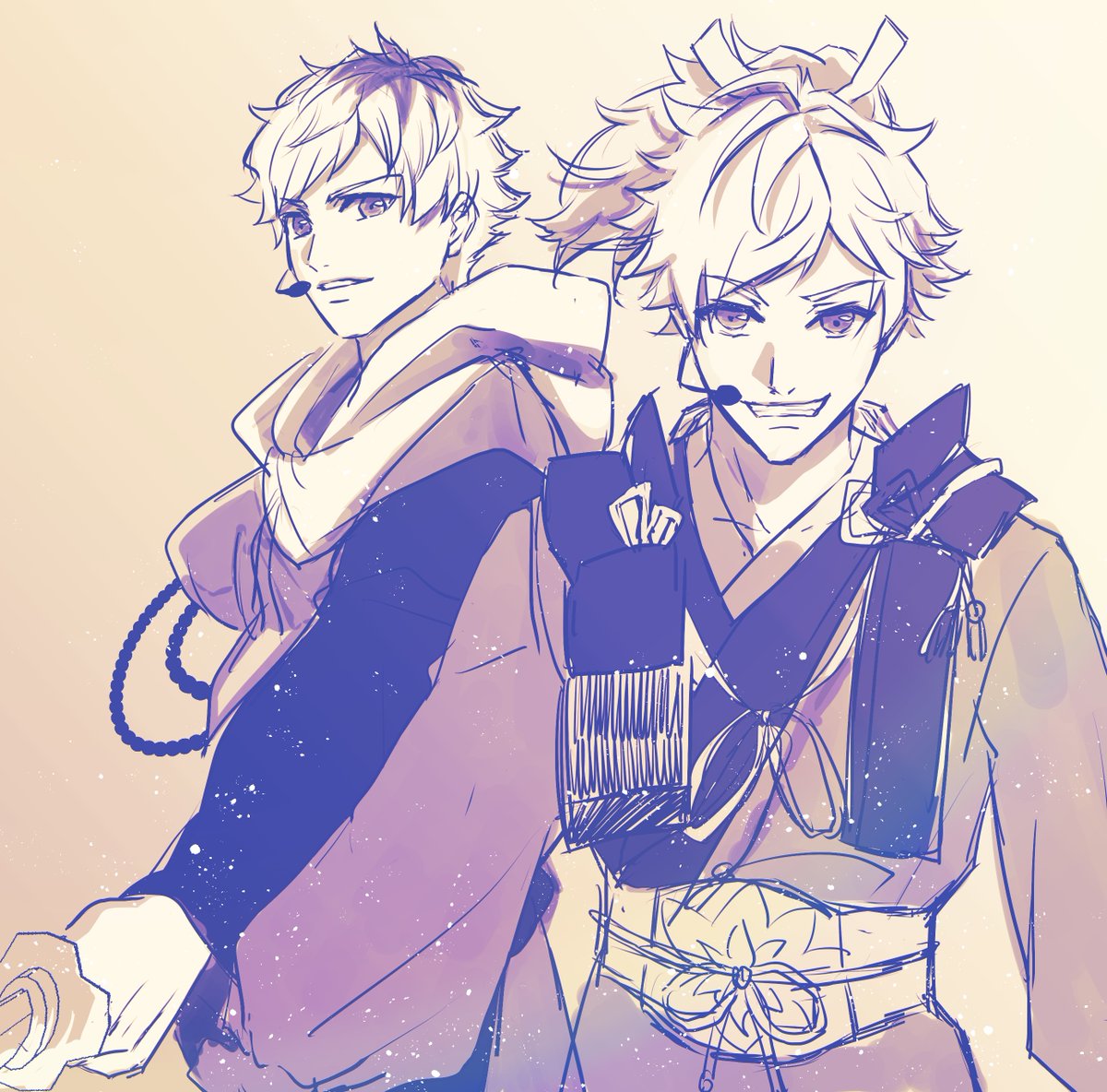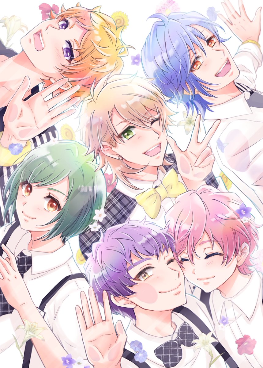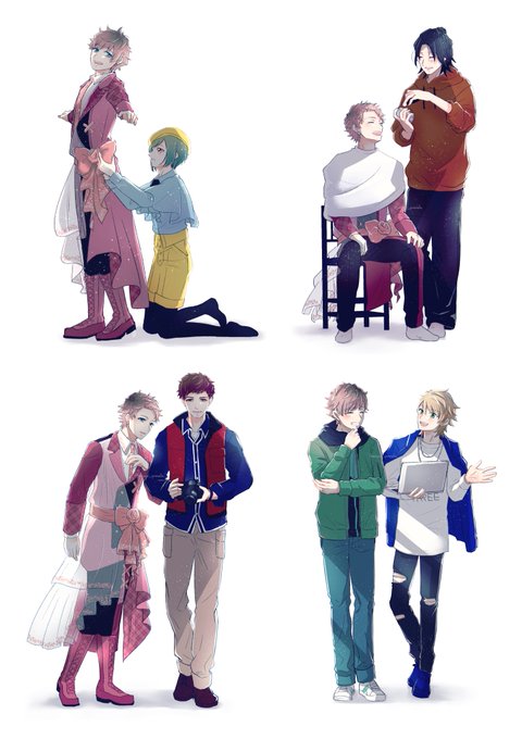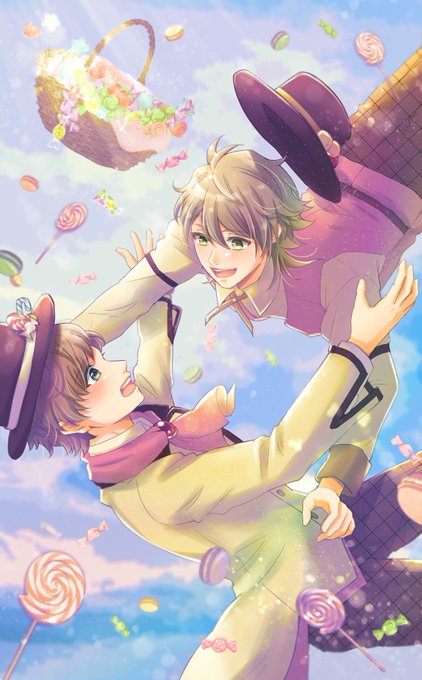 夏組〜〜〜〜!!!!描けた〜!!入稿しました😭✨ フルブルで出す、クリアポストカードセットのために描きました!以前描いた春組と対になってます。咲也と天馬1人ずつのポストカードと合わせて4枚セットの予定です🌸🌻 白背景のとこは透明になってかわいいはず、です!