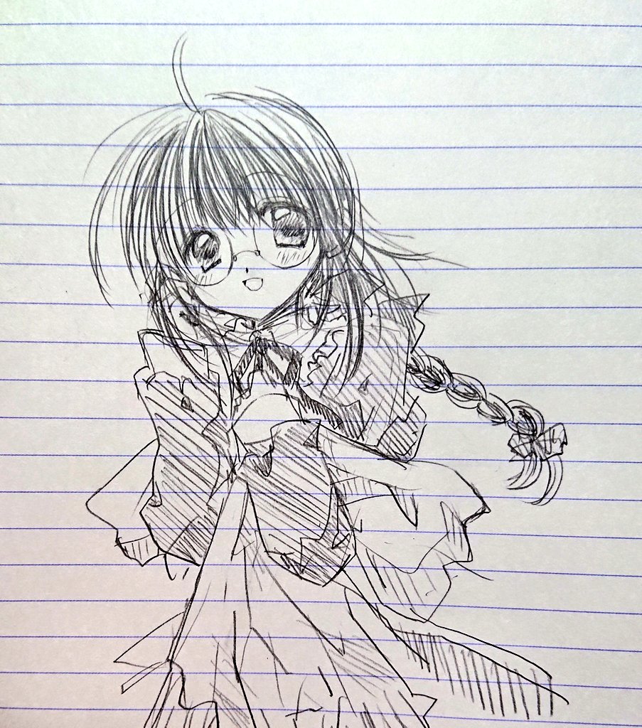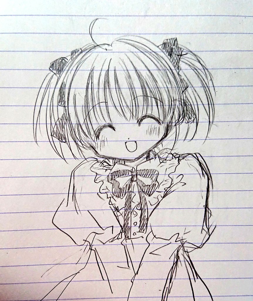 口を描き直し過ぎて黒くなっちゃった。非常に悔しい。ワンピースを描こうとして、見切り発車で描いてたけど、シスプリの雛子がちょっと大きくなった感じになった。 #シスプリ #落書き