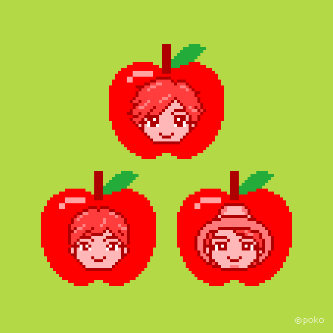 2 15 🍎おめでとー! 🍎ありがとー! 🍎またねー! #一時は果実 #レコ発 #スリーマンライブ #指田フミヤ #近藤晃央 #ダイスケ #ドット絵 #pixelart #fanart 19/08/23 23:09