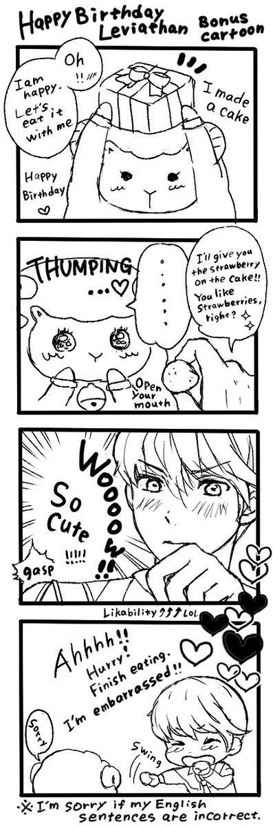 レヴィ誕おまけ落書きまんが🎂🍓 やっぱり照れ顔描きたくなったので(笑) 英語Ver.も作ってみましたが、色々間違っていると思います…。 お許しください💦 #obeymefanart #ObeyMeBD #HappyBirthdayLeviathan #obeymeleviathan