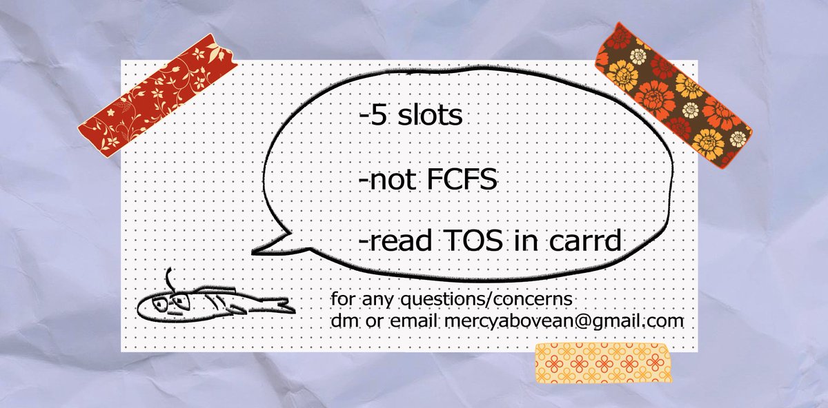 hihi there's 5 slots available it's not FCFS so it'll be open for a few weeks form: forms.gle/cJjvtL6yiqGxUf… my TOS is at: mercyabove.carrd.co thank you for waiting so patiently 🙇♂️
