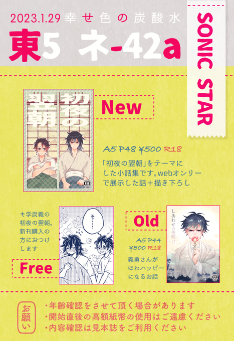 1/29のお品書きです!新刊は引用RTのものです!既刊のイベント頒布は今回で終了の予定で残りは通販になります。無配は新刊におつけしますが無配のみでもお気軽にどうぞ🤗あと1冊目の本とキ学の本が1冊ずつ出てきたので持っていきます全部炭義で500円です。 当日はよろしくお願いします〜! twitter.com/merdeka772/sta…