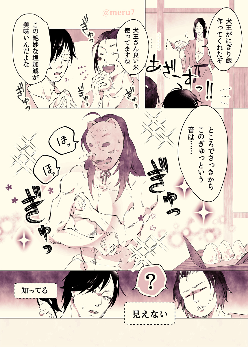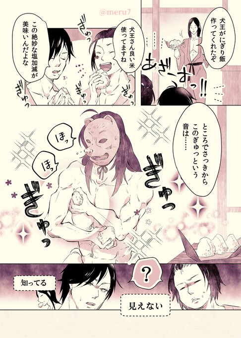 犬王の脇で握ったおにぎりパロを描きました(元ネタが分からない人は魔法陣グルグルを5巻まで読んでください) twitter.com/meru7/status/1…