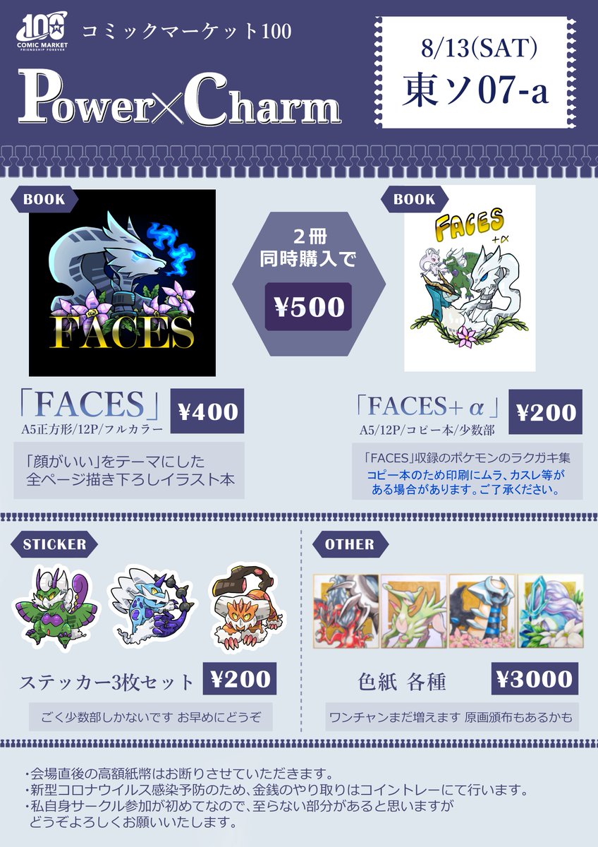 【#C100 お品書き】 とても遅くなりました…! 初参加で正直まだビビり散らかしております。ひぃ 土曜日 東地区 ソ07-aにてお待ちしております! よろしくお願いします👐