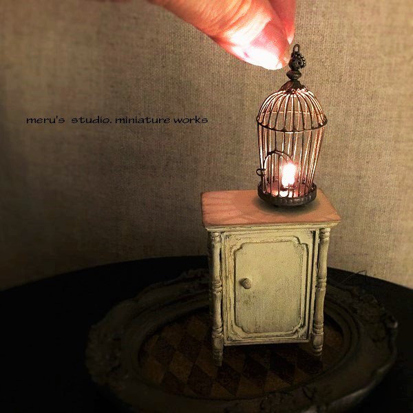 サイドテーブルを2つ。 その上にLED電球を仕込んだバードゲージを置きました。 やはり電気がつく作品は大好きです。 東京ミニチュアショウに出展します。 ブースは52番です。 #ミニチュア #ドールハウス #ミニチュアショウ