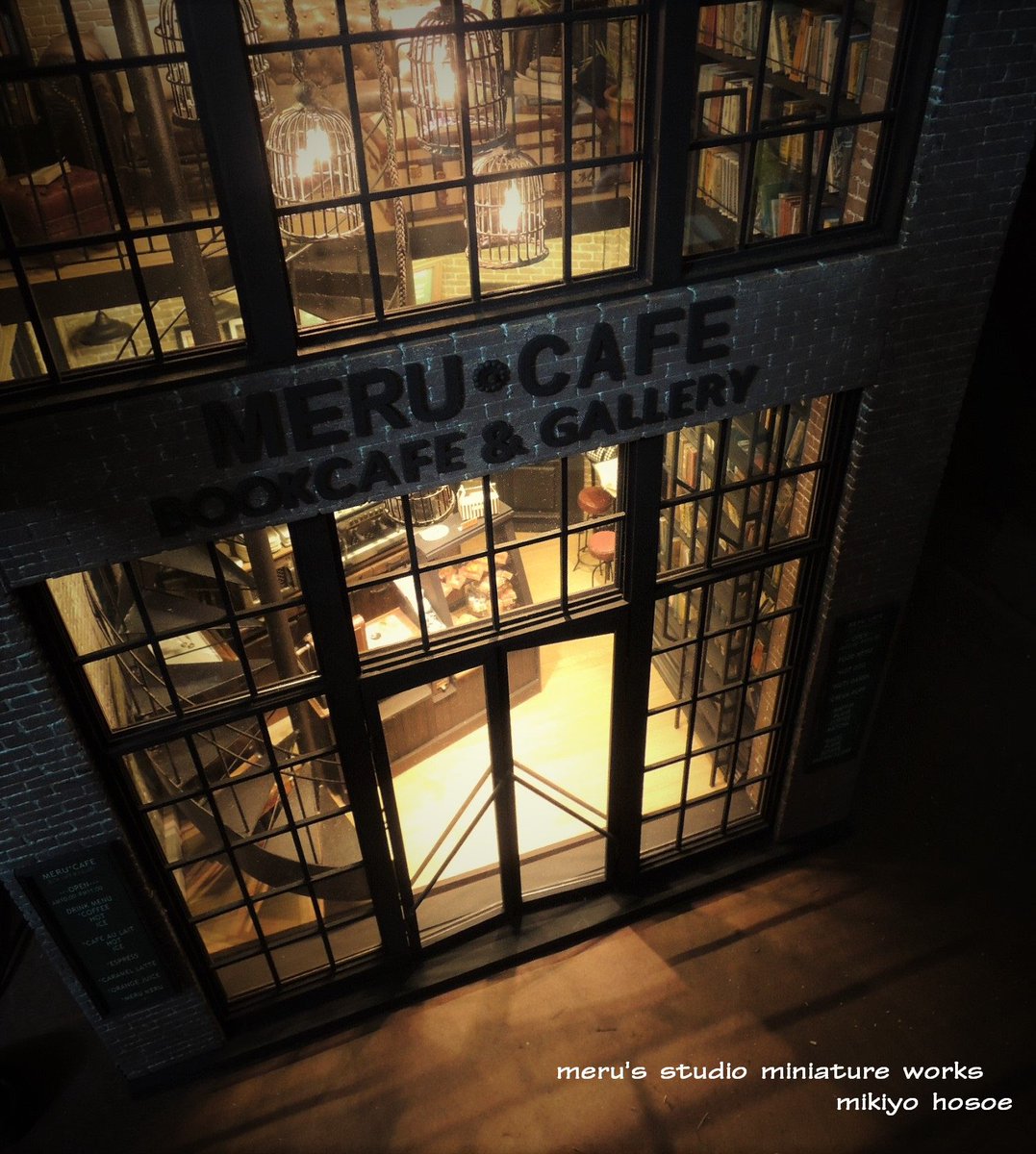メンテ最後の作品。 Cafeから漏れる灯りが影を落とす佇まいが とても好きです。 Book Cafe 〜MERU*CAFE〜 2017年制作 #ドールハウス #3人展
