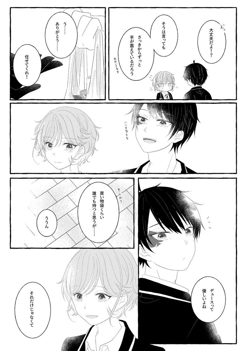 9 143 エー監♀❤️🌸 昨日のべっこんで無配ペーパーにした小話です。 イベントお疲れ様でした❣️ ⚠️男装監督生(デフォ名使用)顔あり喋ります #twstプラス #twst_NL 23/01/30 19:22