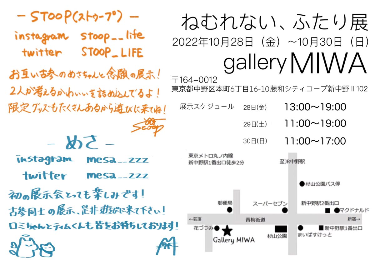 ー展示のお知らせー 10月28日(金)〜30日(日) 【ねむれない、ふたり展】 @STOOP_LIFE ×@mesa__zzz 展示会やります!ぜひ🐈⬛🌙