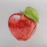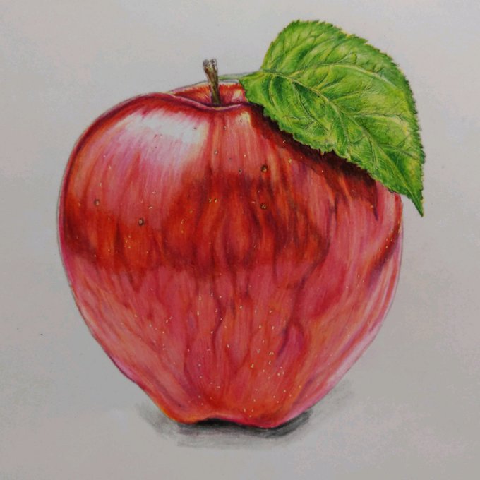 うーん🤔完成? りんごに色が乗らなくなってきたんで。葉っぱも難しかった… 下地の黄色、筆圧強かったようで次の色が乗らなかった…次から気をつけよ #色鉛筆画上達ドリル #イロドリアル #いいりんごの日