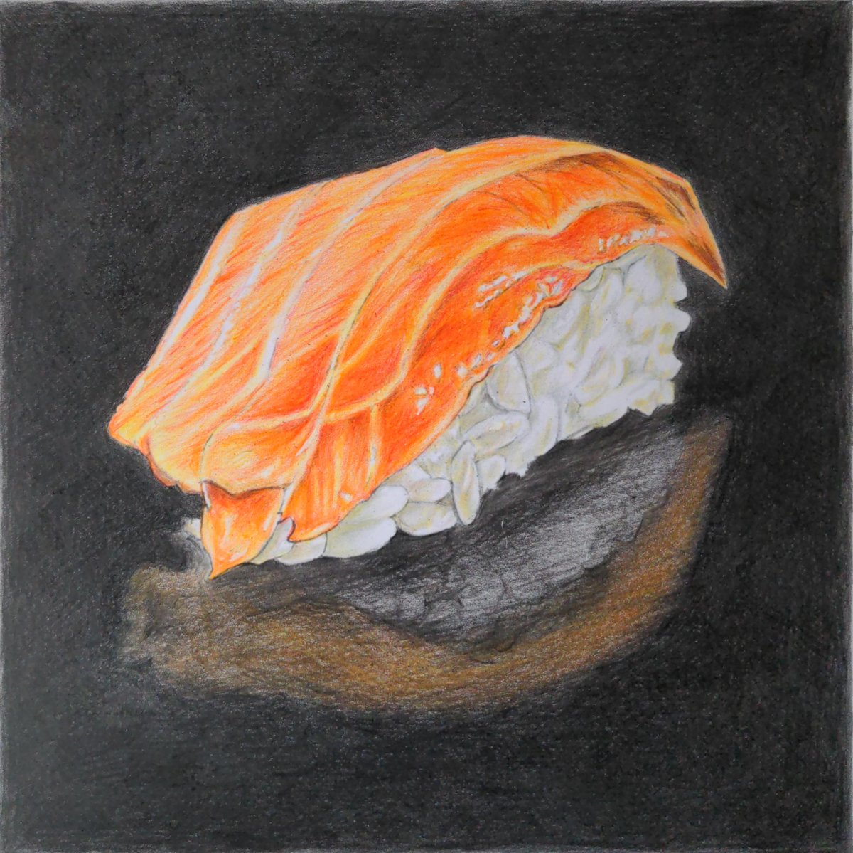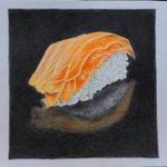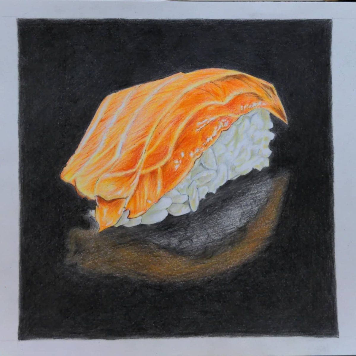 サーモン寿司完成 てか、ギブ🏳 食べ物のツヤ感て難しい💦 そして背景の黒!ムラすごい!黒だけヴァンゴッホを使ってみましたがワックス感強めかつ芯折れ過ぎ問題。芯縦に折れるのとかどうなの😫 最終的にかなり短くなりました #イロドリアル #色鉛筆画上達ドリル