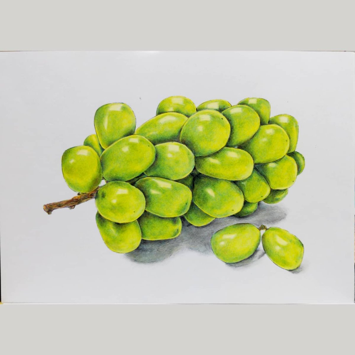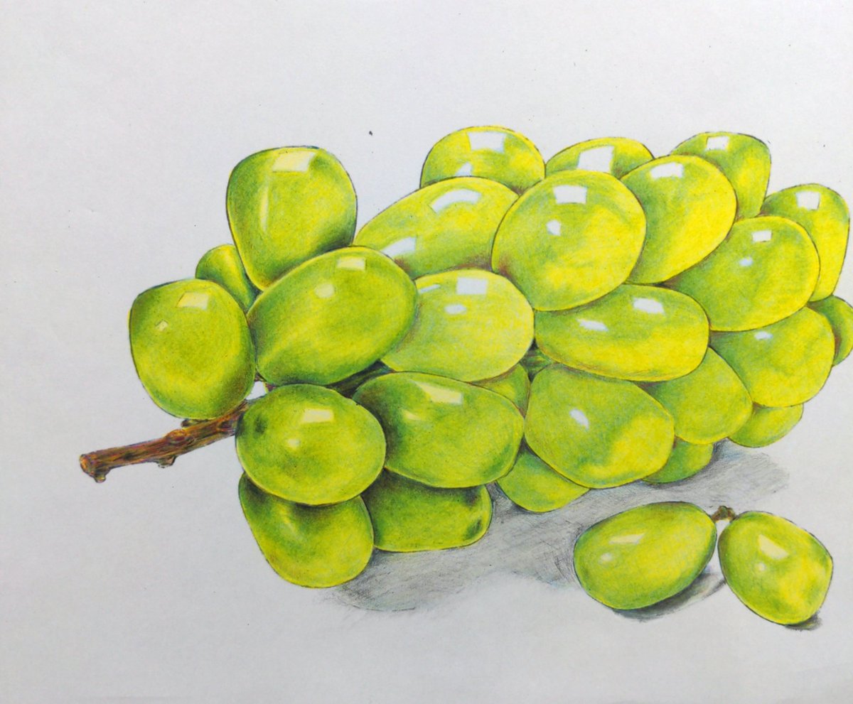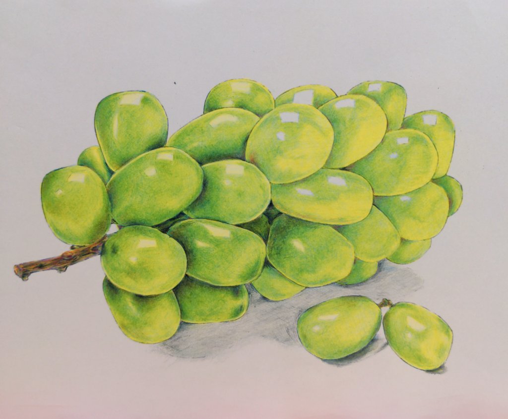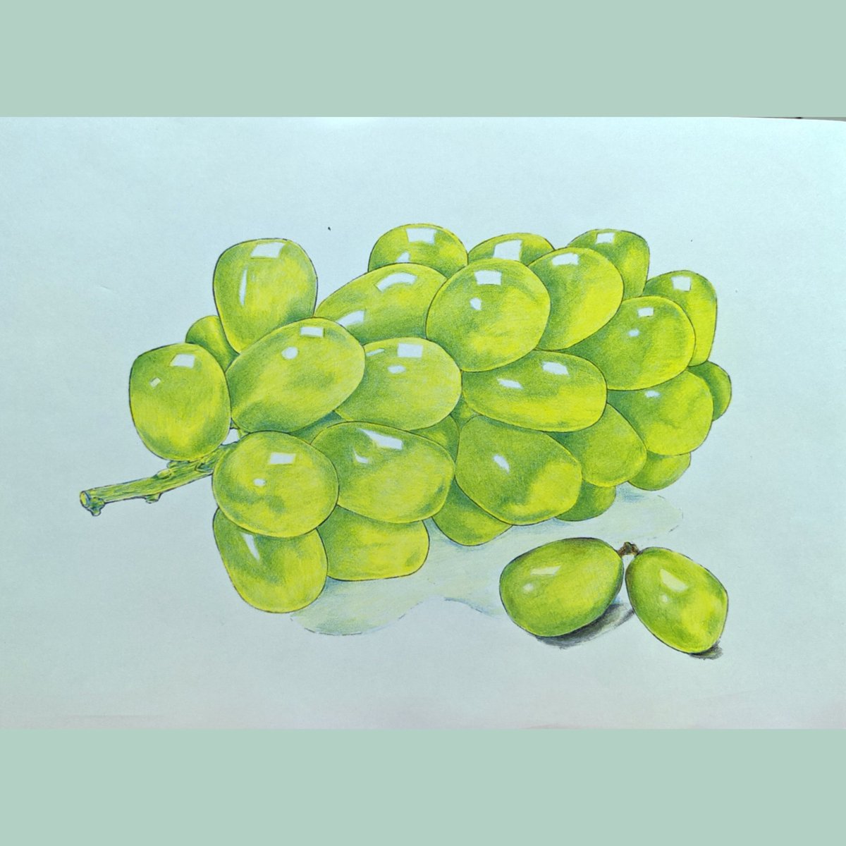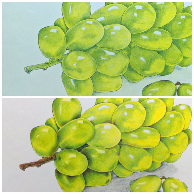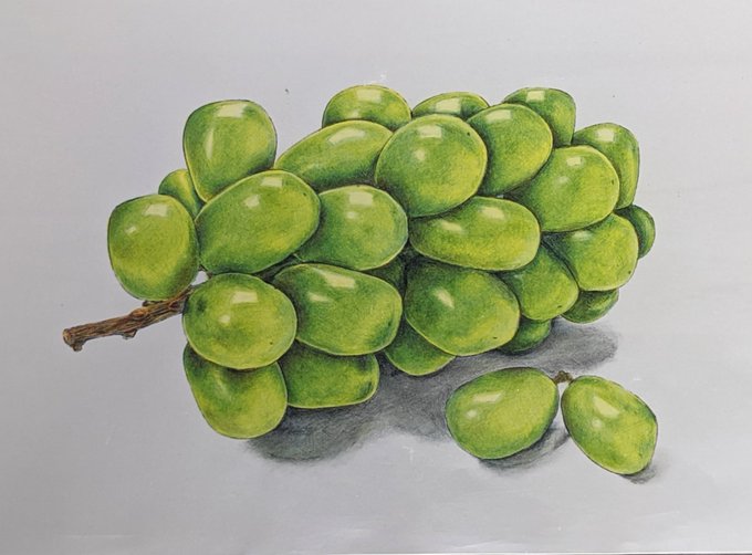 ⸜(*ˊᗜˋ*)⸝ワーイできましたよ うん、できてるできてる(言い聞かせ 一粒づつの塗りも大変でしたが最後に伏兵💦影がなじまなくて妙にくっきり。消しゴムで消すわけにもいかずティッシュでこすって若干薄くしました #イロドリアル #色鉛筆画上達ドリル