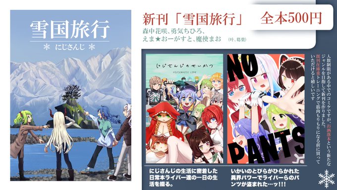 2 7 #C99お品書き 31日/二日目/金曜日 南へ-34b にて、にじさんじのロリ達が北陸へ旅行するイラスト本を出します。よろしくおねがいします。 既刊新刊、500円となっていますので、2日目南に受かった方は是非よろしくおねがいします! 21/12/25 19:22