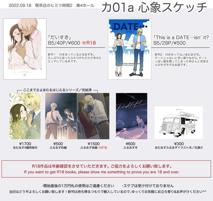 29 147 9/18 喫茶店のヒミツ時間2(あむあずオンリー)お品書きをpixivにアップしました pixiv.net/artworks/10118… 22/09/12 21:22
