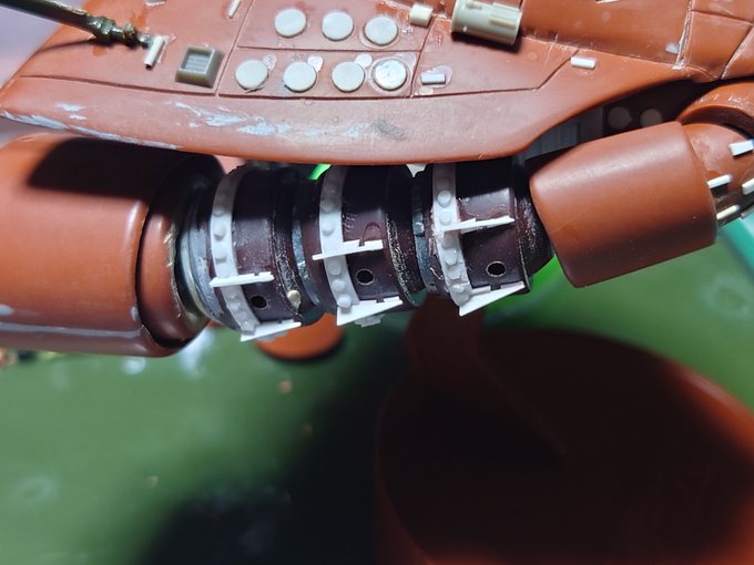 #ガンプラはどんな自由な発想で作ってもいいんだ 牛歩製作 備忘録20221109 HG量産型ガンキャノン係長 上半身を前へ傾く様に加工したから内部チラ見のディテール作らないといけなくなった。さらりと作るつもりが いつもの牛歩だな脚も固定スタンド付けたしなあ、まっいつもの事だから楽しめりゃいいか