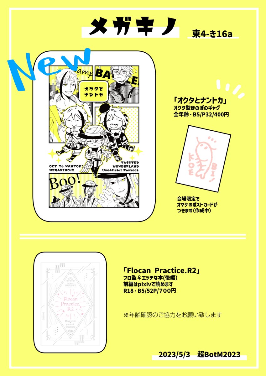 4 17 スパコミスペース出てました! 超BotM2023 東4 き16a メガキノ オクタと監督生さんのなかよしほのぼの漫画の新刊が出る予定です🐚🦐 #twstプラス 23/04/10 18:24