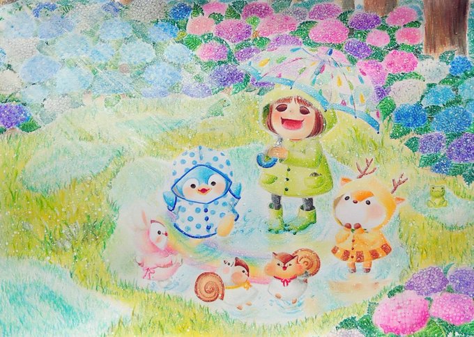 水たまり☔🌈✨ #イラスト #色鉛筆イラスト #色鉛筆 #梅雨 #紫陽花 #梅雨のカラフル芸術祭