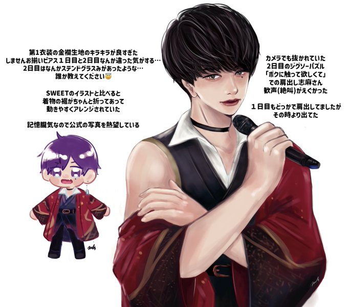 備忘録① 初日誰しもが「あの羽織の下、そうなってんの⁉️」と衝撃を受けたと思っている 衣装うろ覚えですのでご注意ください🙇♀️ #志麻センラ2023 #しまーと
