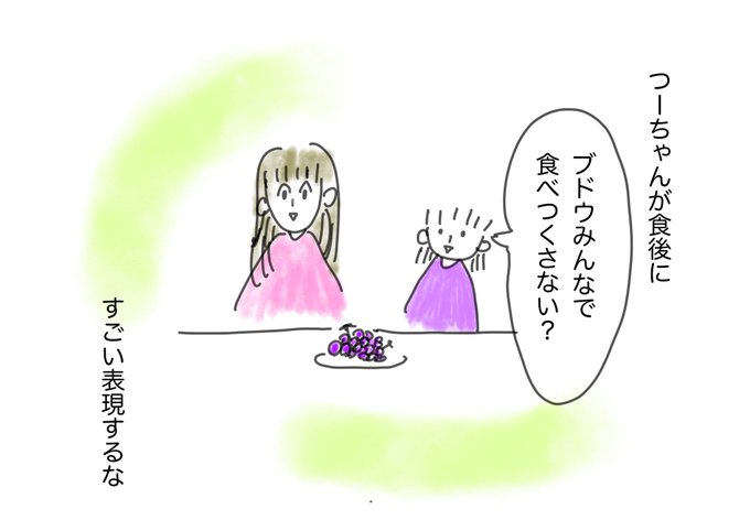 つーちゃんは食べ物の恨みめっちゃもつタイプやな🤔 ブドウめっちゃあるのに3個以上食べたら「食べるの早い」ってキレられた🤨 果物も1人1人のお皿にしないとダメな感じです😓 #大皿ができない #食い意地すごい #食べ物への執着心 #育児漫画 #育児絵日記
