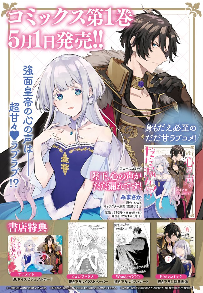 【お知らせ】コミカライズ版「陛下、心の声がだだ漏れです!」第1巻ですが、大変有難いことに重版のご報告いただきました……!🙏🙏 まだの方は是非お手にとって頂けたら嬉しいです💓 twitter.com/FlosComic/stat…