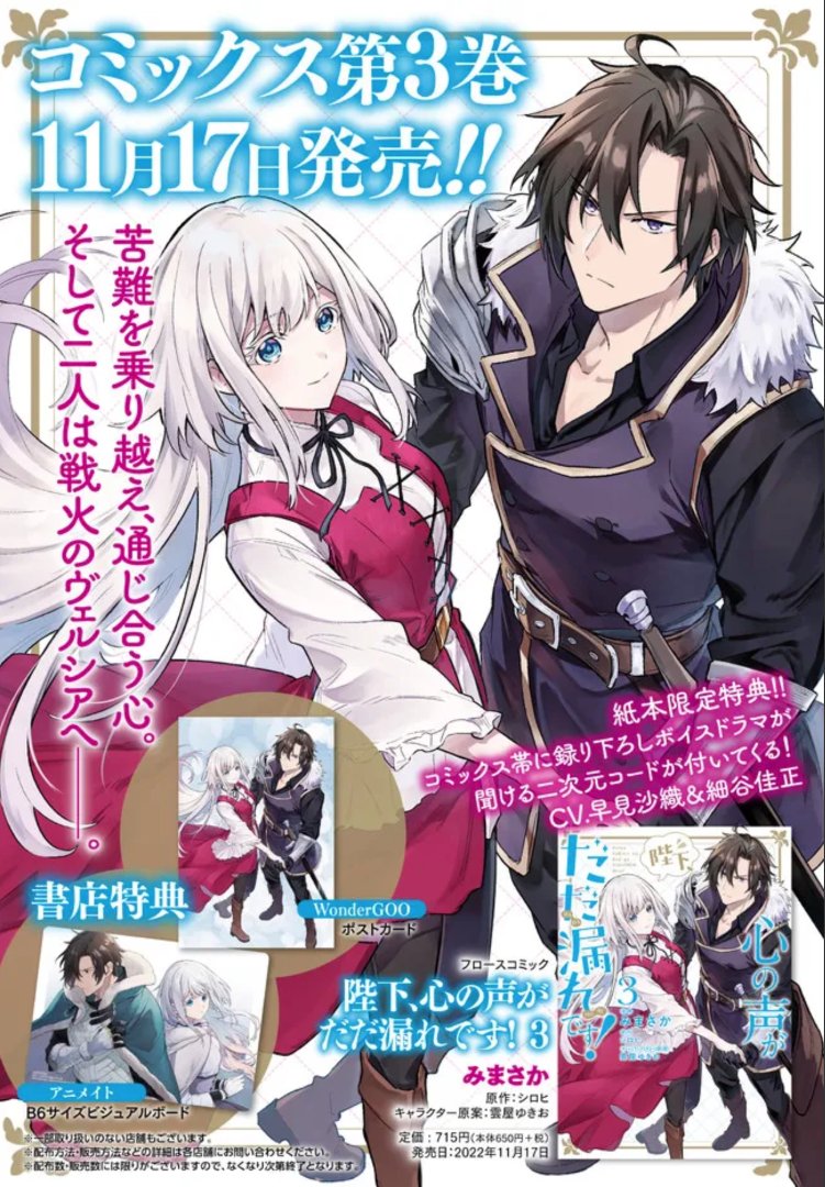 『陛下、心の声がだだ漏れです!』 コミカライズ3巻が11月17日(木)に刊行予定です! 📚店舗特典はアニメイト様とWonderGOO様です。 なんと紙コミックス限定でボイスドラマが付いてきます!✨✨ ボイスドラマ冒頭のお試し版も11月17日10時よりYouTubeにて公開予定です❣️ ▷kadokawa.co.jp/product/322207…