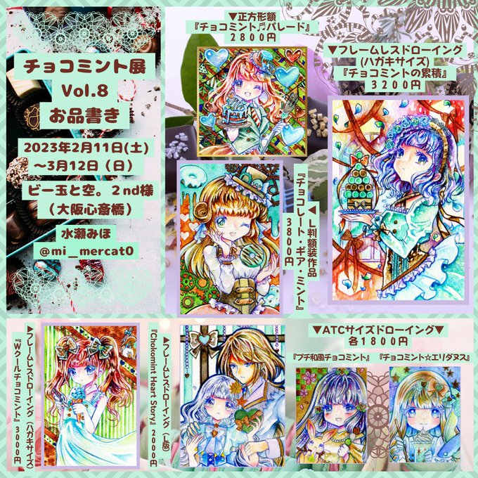 2/11(土)〜3/12(日) ビー玉と空。2nd様@be_sora2nd にて開催の『チョコミント展Vol.8』に参加致します🍫🌱 主催は棘 饗様🎵@claw_kk02 額装2点、ハガキサイズ2点、L版サイズ1点、ATCサイズ2点描きました。 引用元に各画像載せています。 念願の初参加🥰 よろしくお願い致します🎵 #チョコミント展8 twitter.com/mi_mercat0/sta…