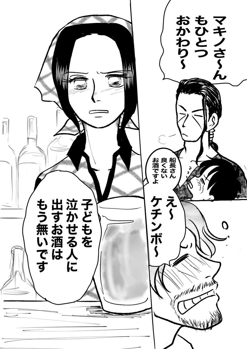 お頭、おめでとさん 既刊からちょっとだけ公開なシャンマキっぽいの4ページ こんな感じだったら笑えるって妄想です カッコいいシャンクスは、おれには描けないんだぜ(笑) #シャンクス生誕祭2022 #シャンクス誕生祭2022